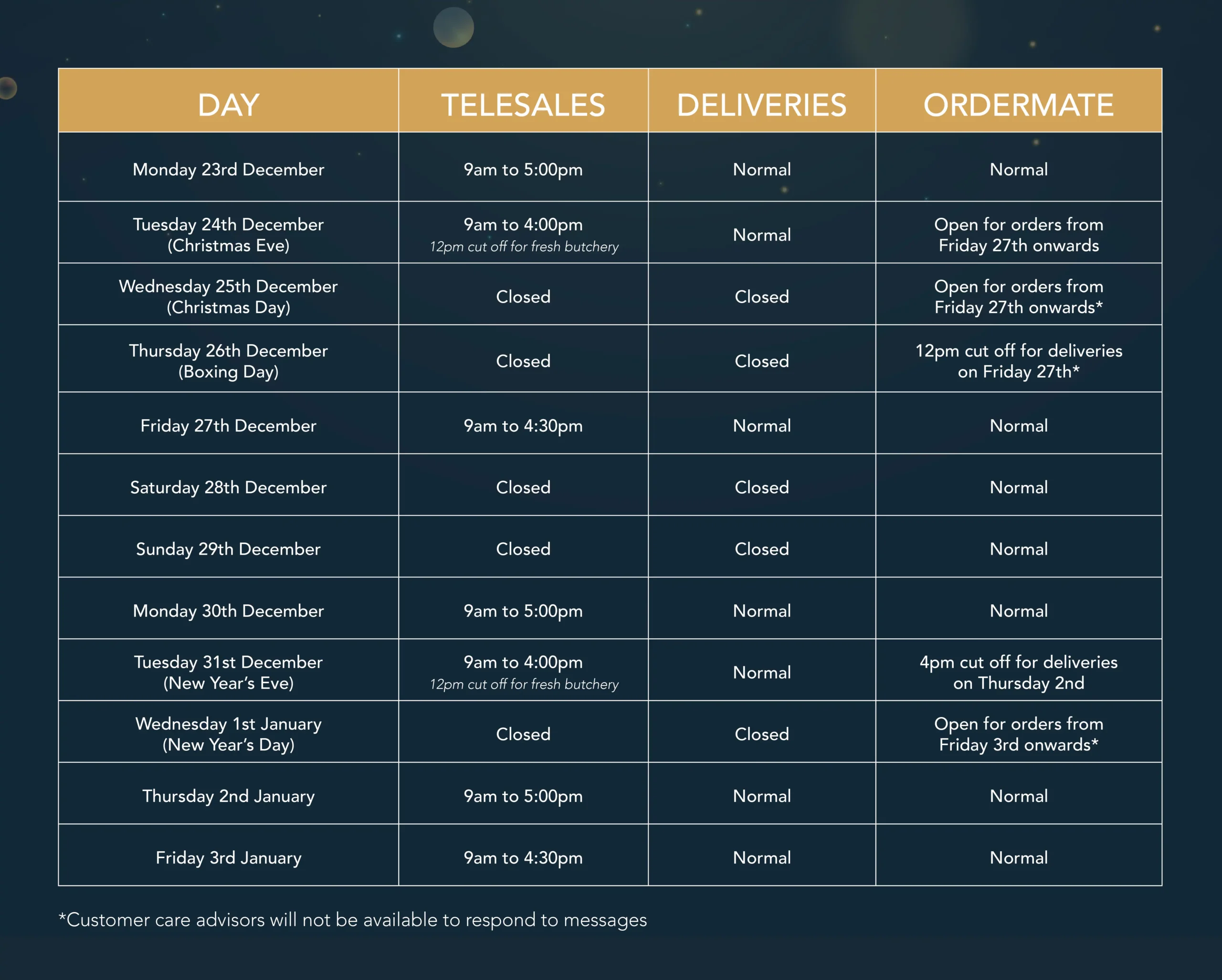 We’ll be here right up until Christmas Eve with adjusted cut-offs for fresh butchery and fruit & veg, then taking a short breather before we’re back on Monday 29th December. As always, our team is on hand to support you, and you can always place orders via OrderMate. From everyone at Birchall Foodservice, thanks for your continued partnership. We hope you have a wonderful Christmas and a cracking start to the New Year.